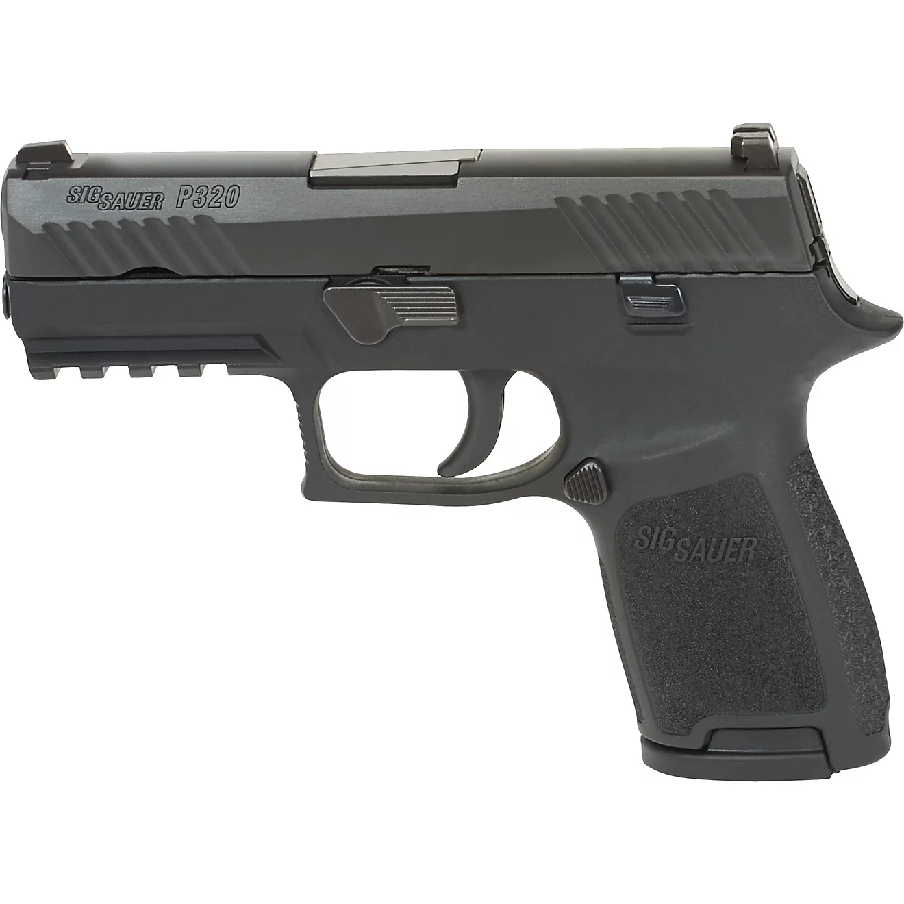 Le pistolet semi-automatique compact Sig Sauer P320 est un pistolet léger à cadre en polymère, à percussion, suffisamment petit pour être dissimulé mais suffisamment grand pour être puissant. Une détente douce et constante permet un placement précis du tir et un tir rapide et contrôlé.